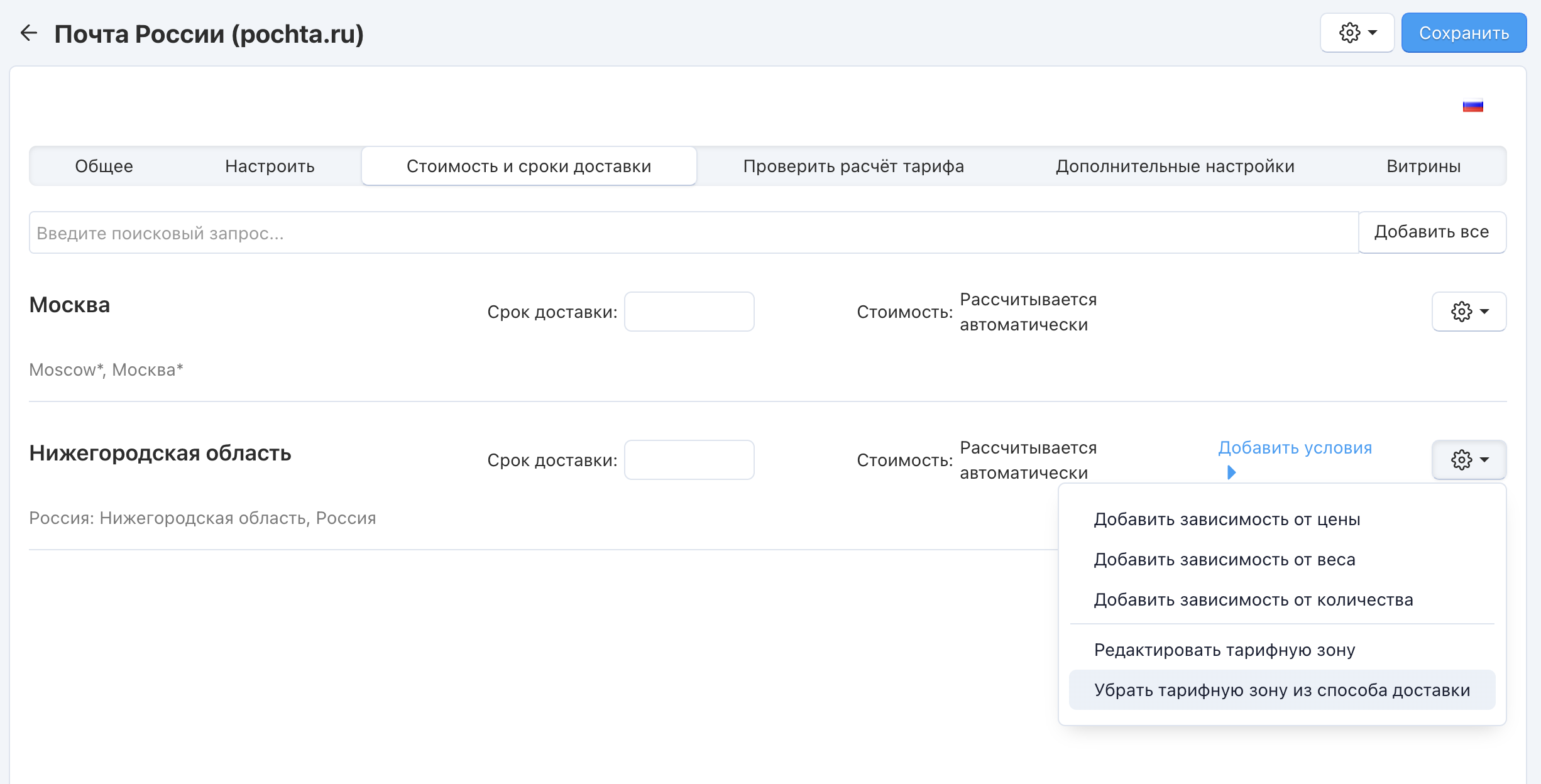 Не забудьте галочку Добавить во все способы доставки с расчётом в реальном времени при создании новой тарифной зоны. В ином случае, она автоматически привяжется ко всем существующим в магазине способам доставки c расчётом тарифа в режиме реального времени. Если вы не хотите предлагать способы доставки в этой тарифной зоне, вам придётся отвязывать её вручную.
