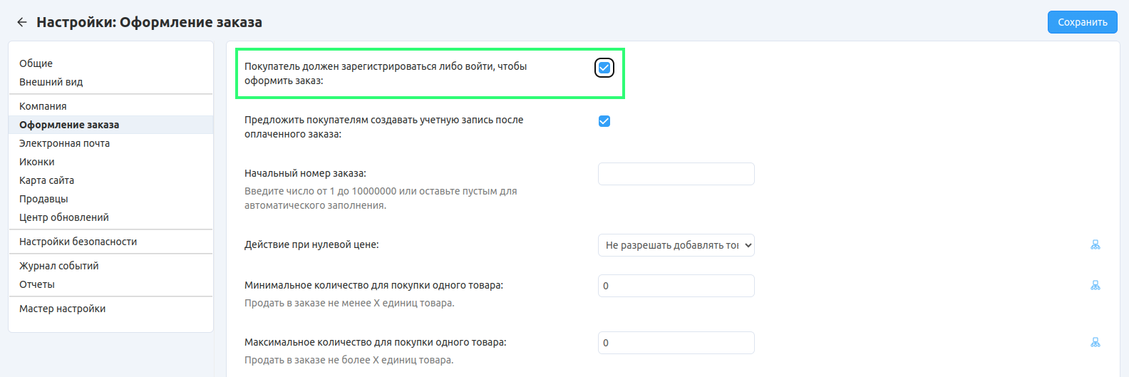 - Поставьте галочку Покупатель должен зарегистрироваться либо войти, чтобы оформить заказ.
