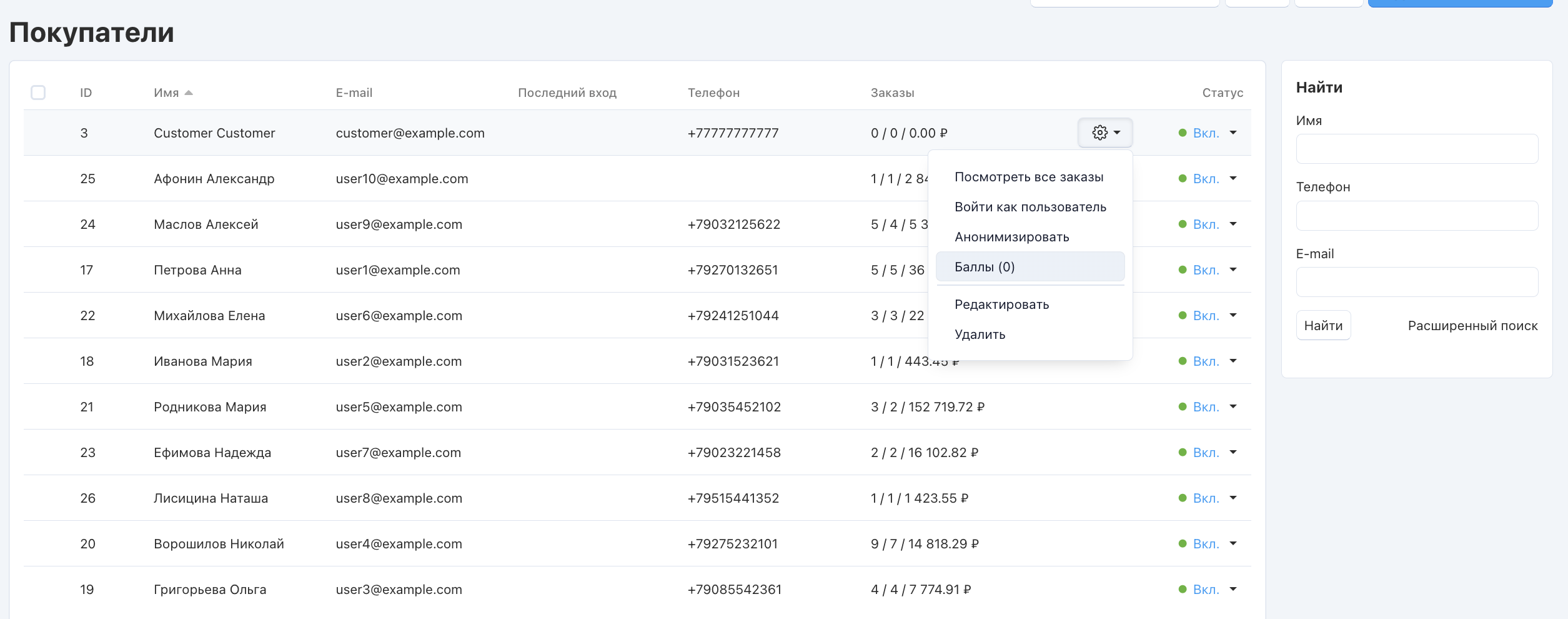 Модуль Бонусные баллы позволяет создать в магазине программу лояльности, основанную на бонусных баллах. Если включить модуль, то на станице Пользователи → Покупатели при нажатии на кнопку с изображением шестеренки рядом с учетной записью появится пункт Баллы.