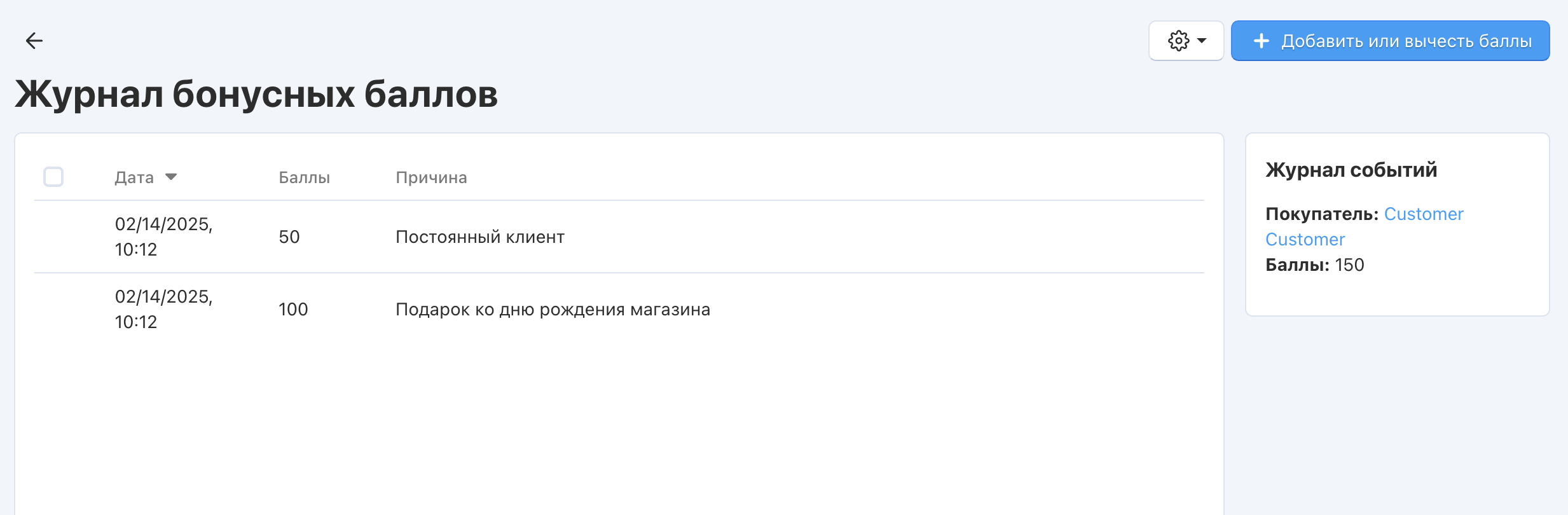 Если нажать на Баллы, откроется журнал бонусных баллов покупателя с текущим балансом и историей. Там администраторы могут вручную добавить или вычесть баллы, используя кнопку + Добавить или вычесть баллы.