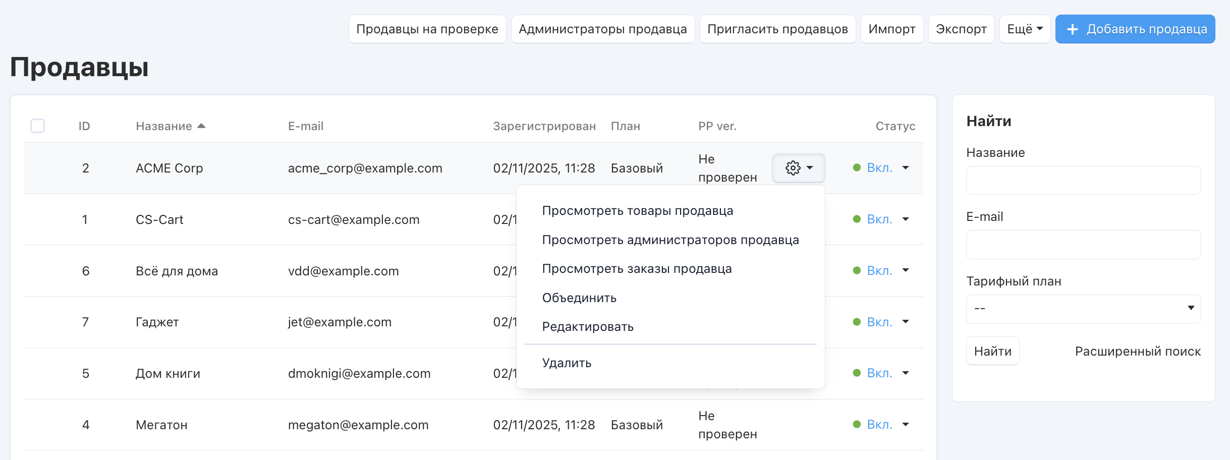 - Откройте страницу Пользователи → Администраторы → Администраторы продавца.