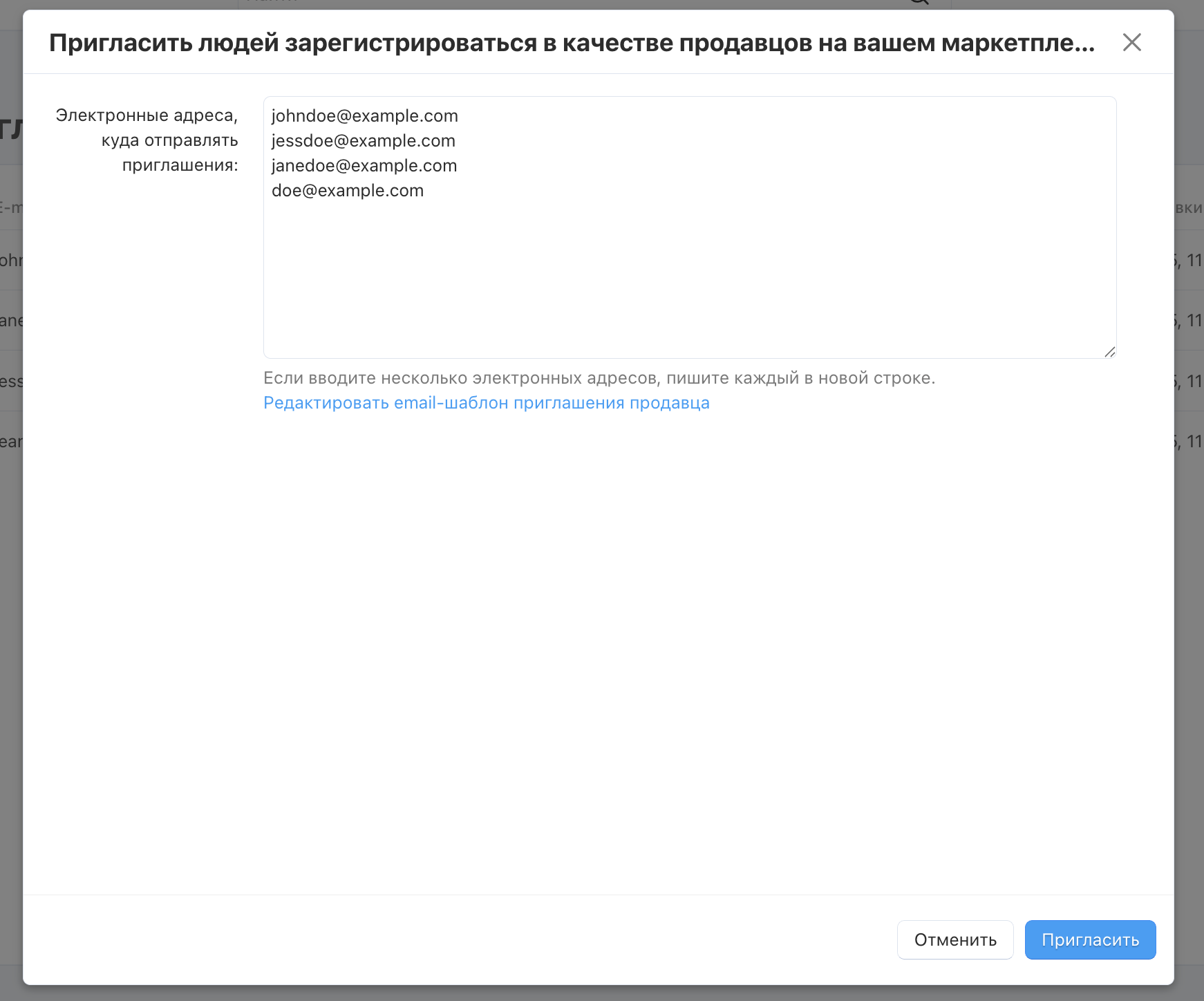 Введите электронные адреса тех, кого вы хотите пригласить на маркетплейс. Если адресов много, то вводите каждый в новой строке.