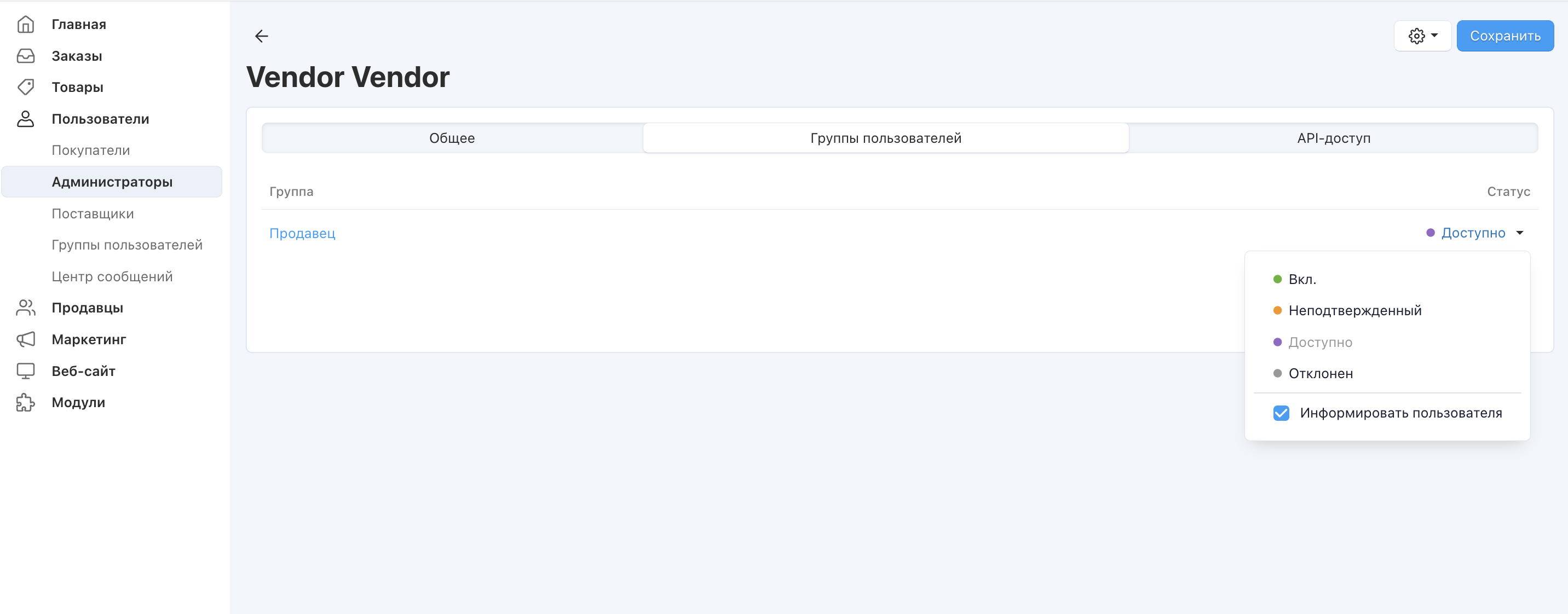 В панели администратора перейдите в меню Пользователи → Администраторы → Администраторы продавцов.