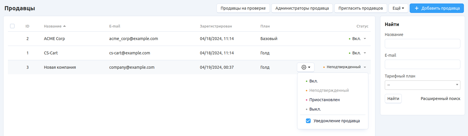 Новые продавцы получат статус Неподтверждённый, если в настройках модуля “Премодерация данных продавцов” включена Проверка новых продавцов.