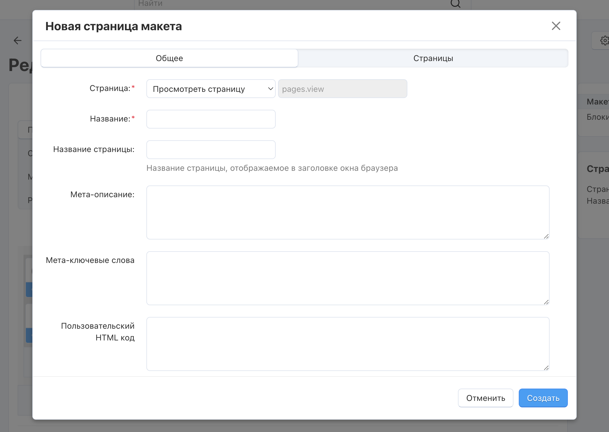 В CS-Cart структуру конкретной страницы, расположение блоков на ней и пр. определяет страница макета. Поэтому прежде чем менять дизайн страницы, создайте страницу макета. Далее привяжите страницу макета к новой странице, созданной в Шаге 1:
