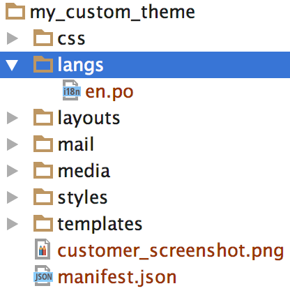 Через тему можно добавлять языковые переменные и переводы. Файлы с языковыми переменными темы хранятся в теме в подпапке langs и имеют названия вида [language_code].po (например, en.po).