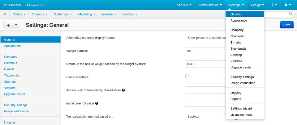 - Общие настройки задают поведение CS-Cart в целом и не зависят от того, установлен ли соответствующий модуль.