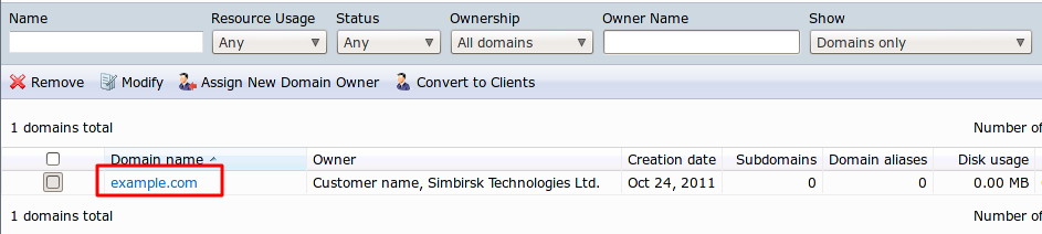 Кликаем по ссылке Domains на главной странице Plesk панели.