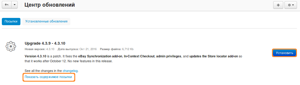 2.4. Когда загрузка закончится, пользователь получит извещение о том, что обновление готово к установке. Для того, чтобы перед обновлением просмотреть список изменений, перейдите по ссылке Показать содержимое посылки.