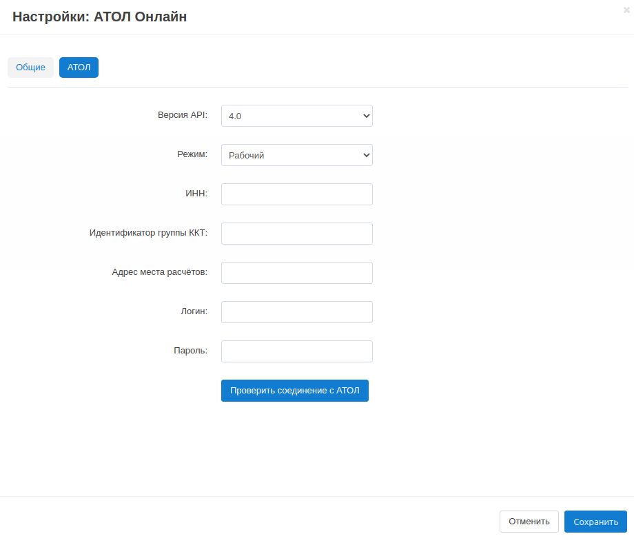 - Пароль — пароль пользователя для отправки данных. Его можно получить из файла настроек для CMS в личном кабинете пользователя “АТОЛ Онлайн”.