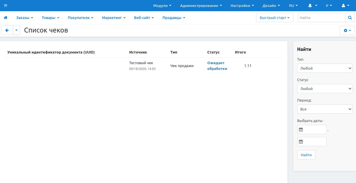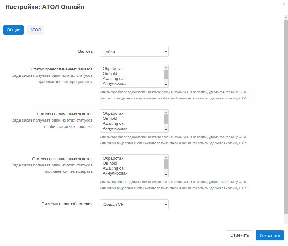 - Статусы возвращённых заказов — статусы заказов, при которых на онлайн-кассе должен пробиваться чек возврата.