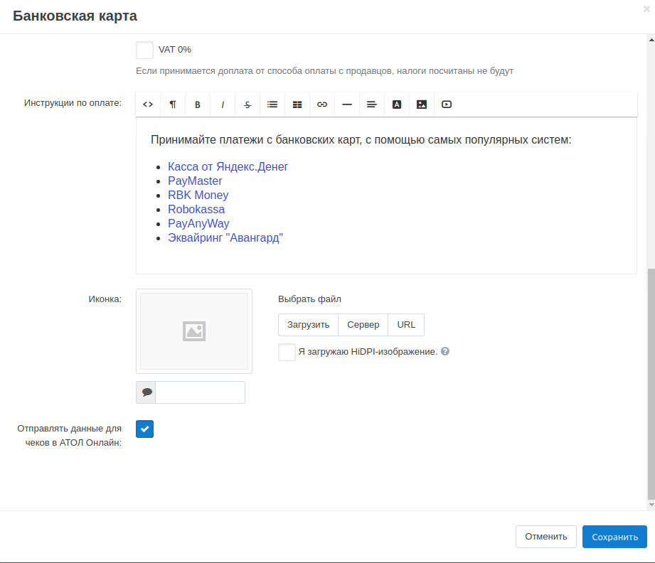 Повторите эти действия для всех способов оплаты, для которых нужно использовать онлайн-кассу.
