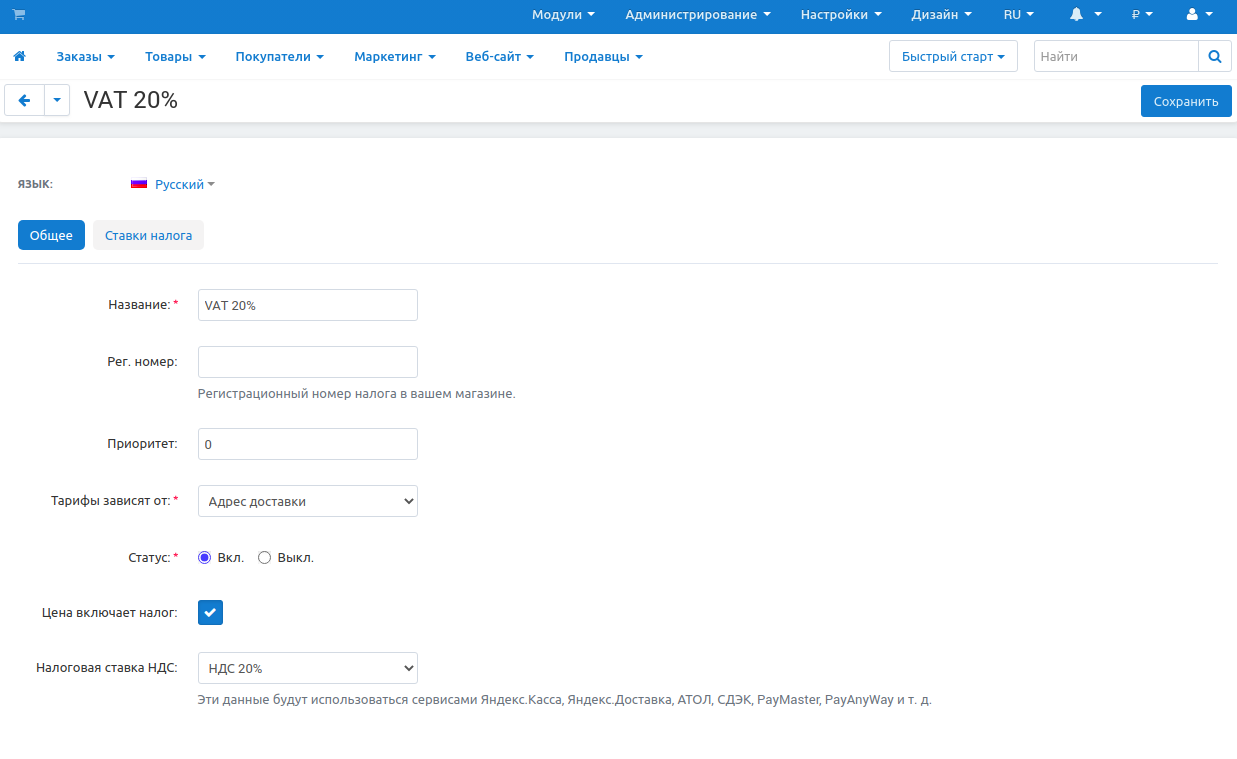 В выпадающем списке Налоговая ставка НДС выберите тип НДС из онлайн-кассы, которому соответствует этот налог из CS-Cart.