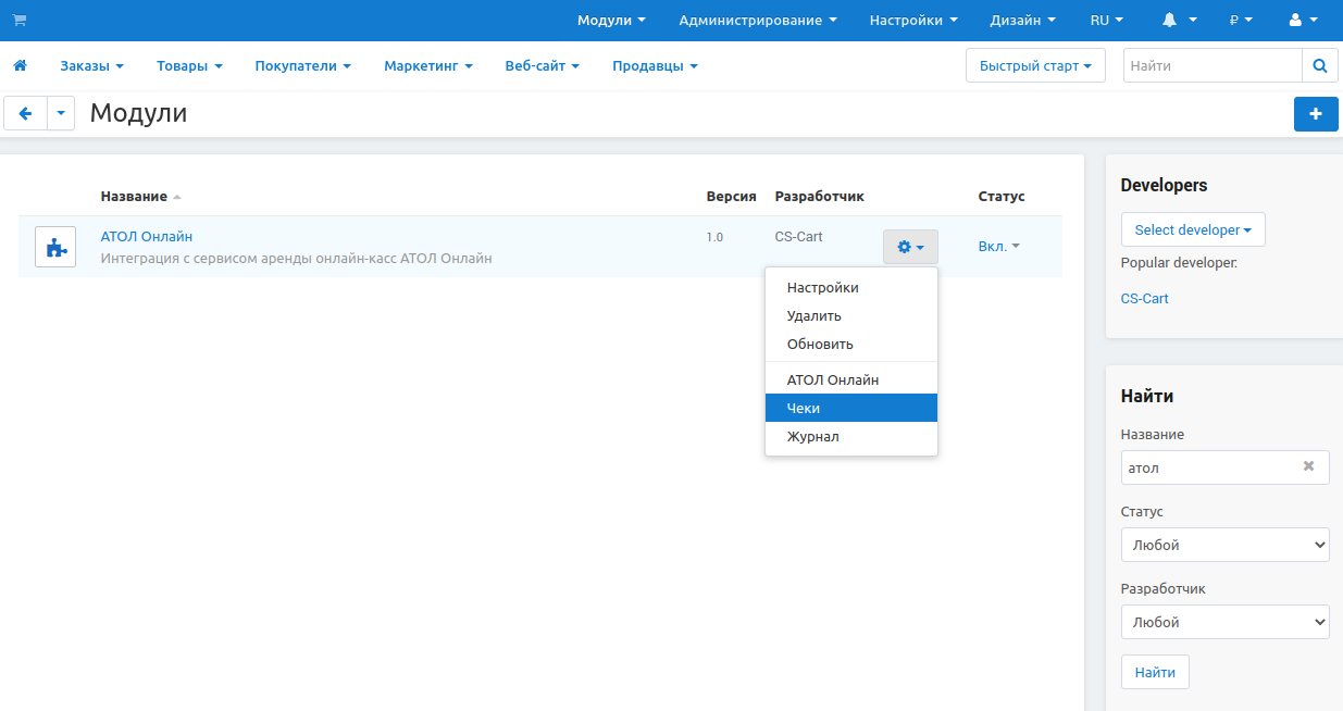 Откройте страницу Модули → Управление модулями. Найдите модуль АТОЛ Онлайн и нажмите на шестерёнку рядом с его статусом.