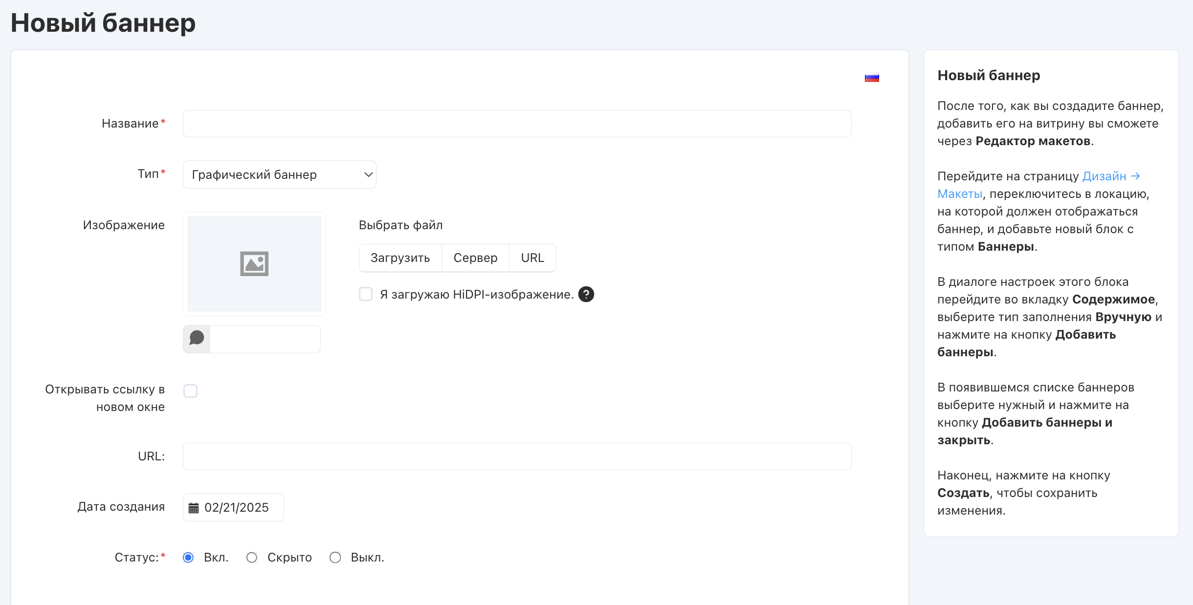 • Для Графического баннера загрузите изображение и укажите URL страницы, на которую будет вести баннер. Здесь также можно выбрать, открывать ли ссылку на эту странцу в новом окне.