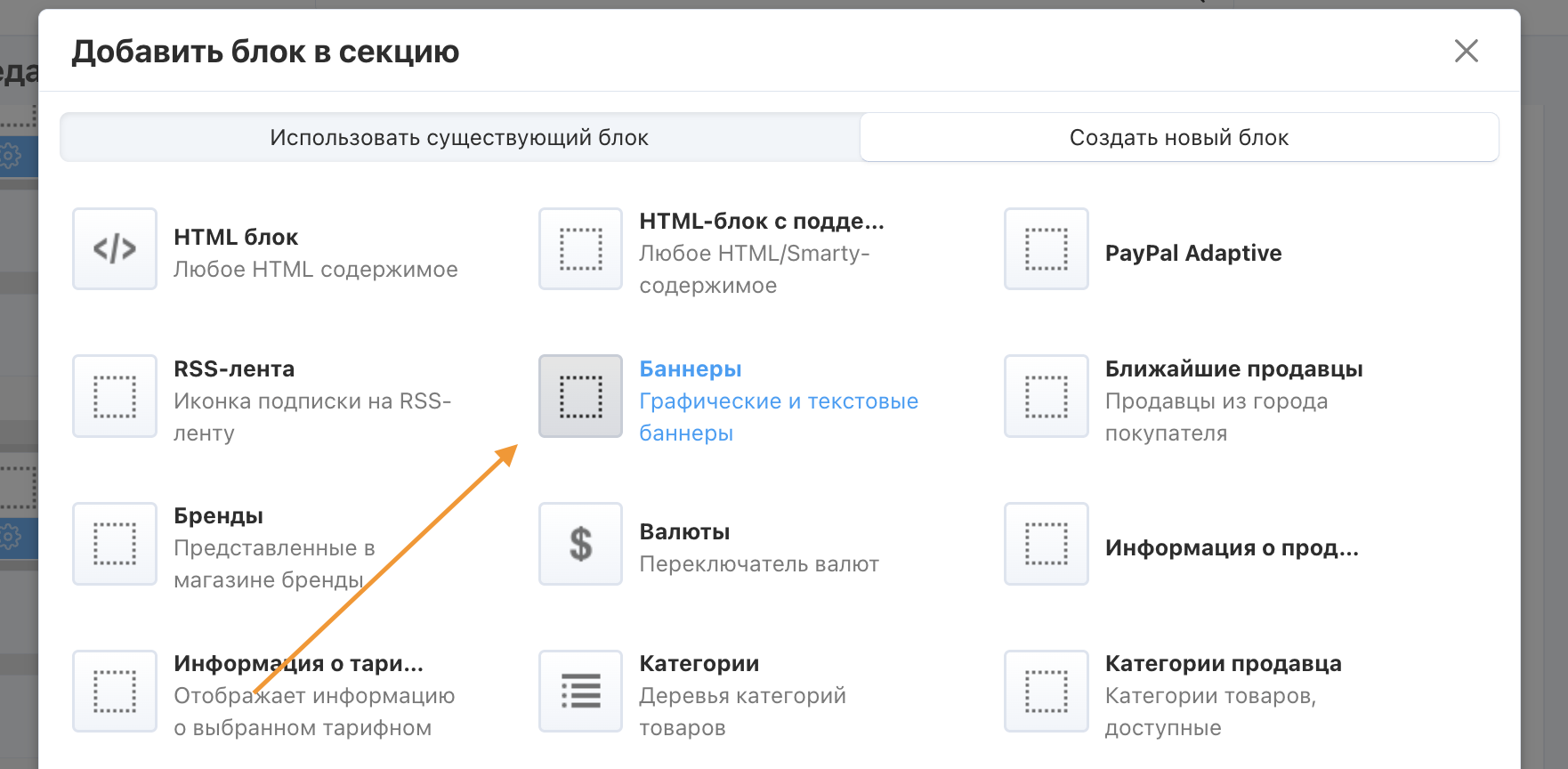 2.4. Откроется страница добавления блока. Переключитесь на вкладку Создать новый блок и выберите Баннеры.