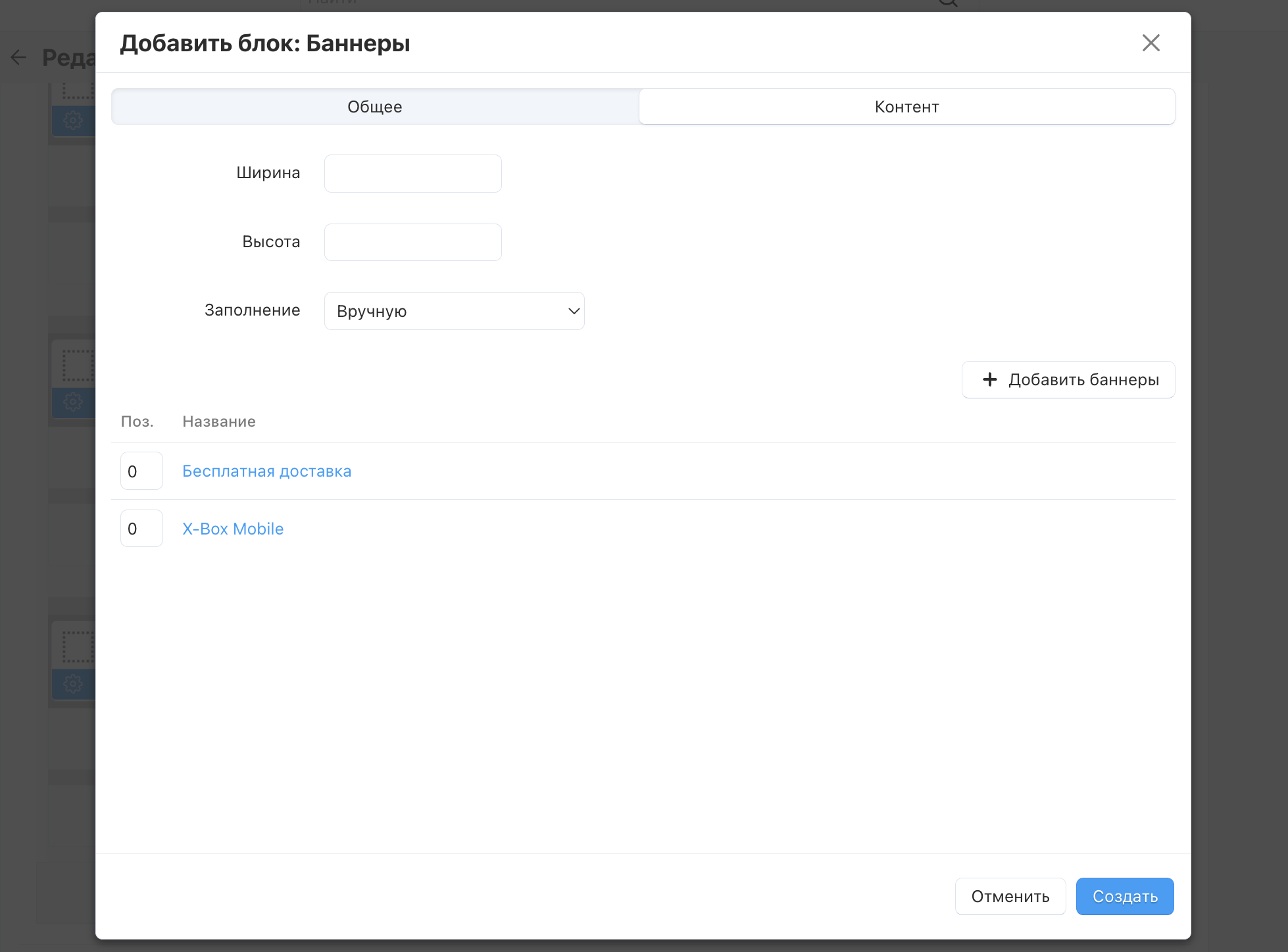 2.6. Перейдите на вкладку Контент, в поле Заполнение выберите Вручную и нажмите кнопку Добавить баннеры, чтобы выбрать баннеры, которые будут отображаться в этом блоке.