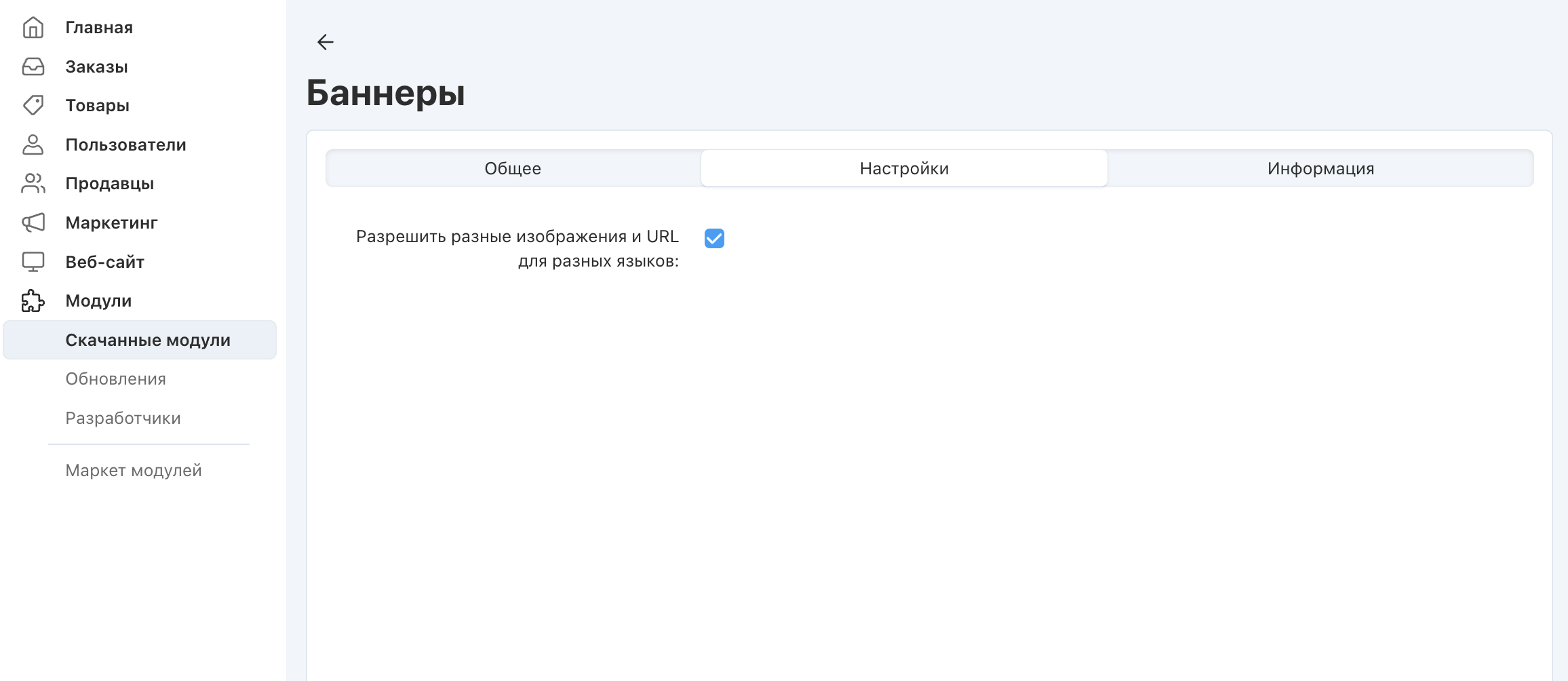• Разрешить разные изображения и URL для разных языков — поставьте галочку, чтобы разрешить использование разных изображений / URL-адресов для одного объекта на разных языках (когда в магазине задействовано несколько языков).