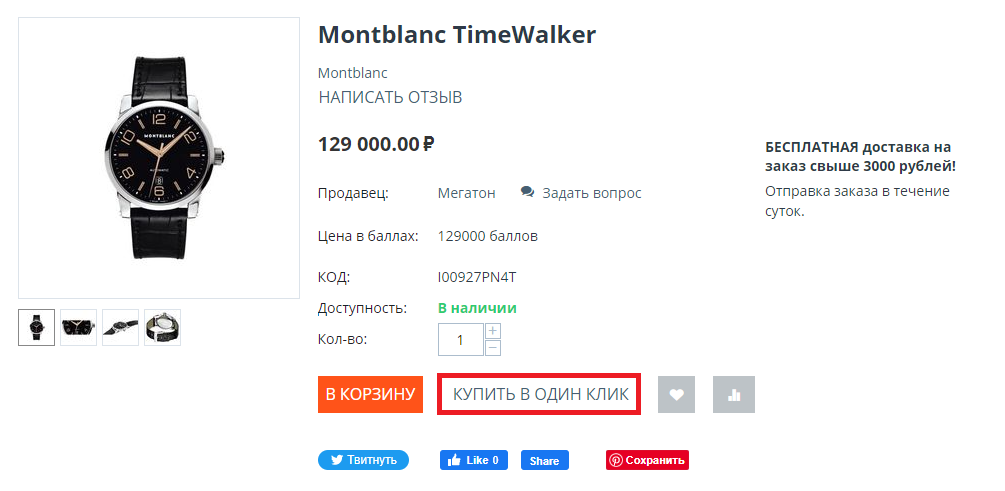 - Включить опцию “Купить в один клик” — Поставьте галочку, если хотите отображать кнопку Купить в один клик на детальной странице товара на витрине.