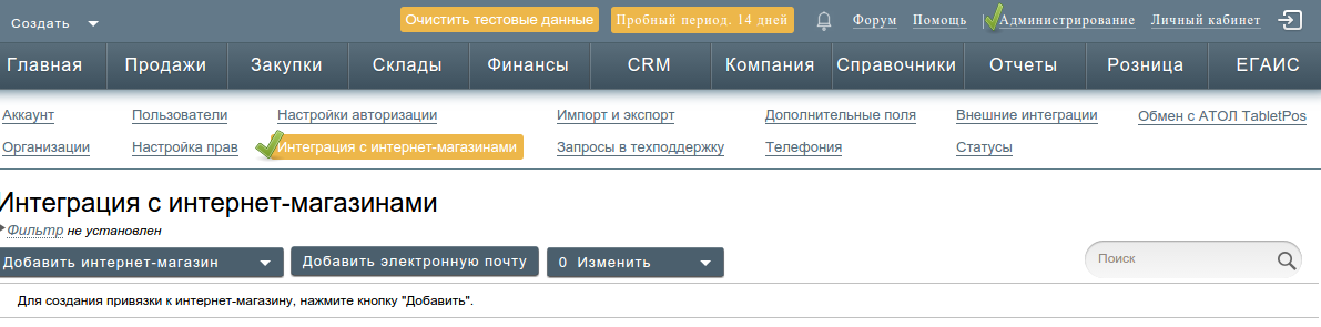 2. Зайдите в “Администрирование” → “Интеграция с интернет-магазинами”.