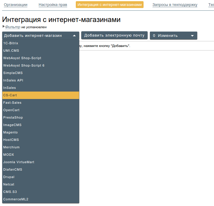 3. В окне интеграции добавьте новый магазин “Добавить интернет-магазин” → “CS-Cart”.