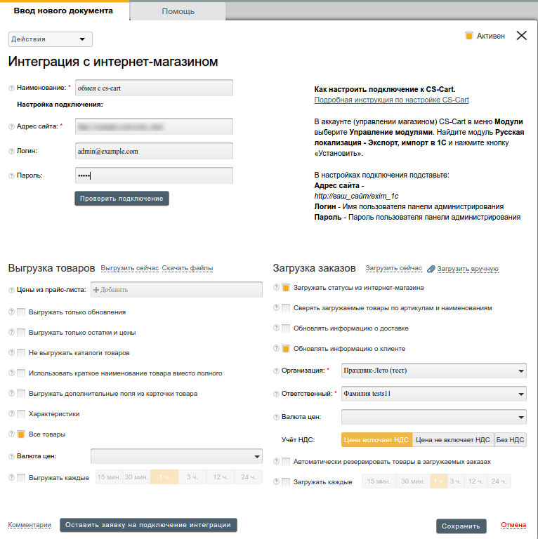 • Адрес магазина — адрес скрипта в магазине, который будет обрабатывать выгружаемые файлы. Его можно увидеть в настройках обмена на стороне CS-Cart; обычно он выглядит наподобие https://example.com/commerceml.