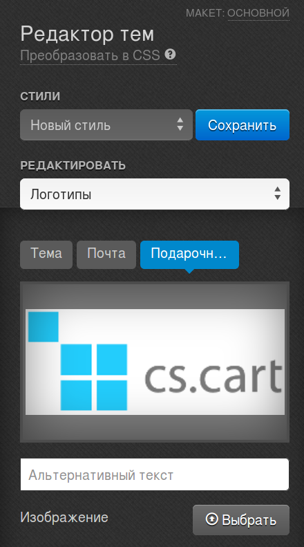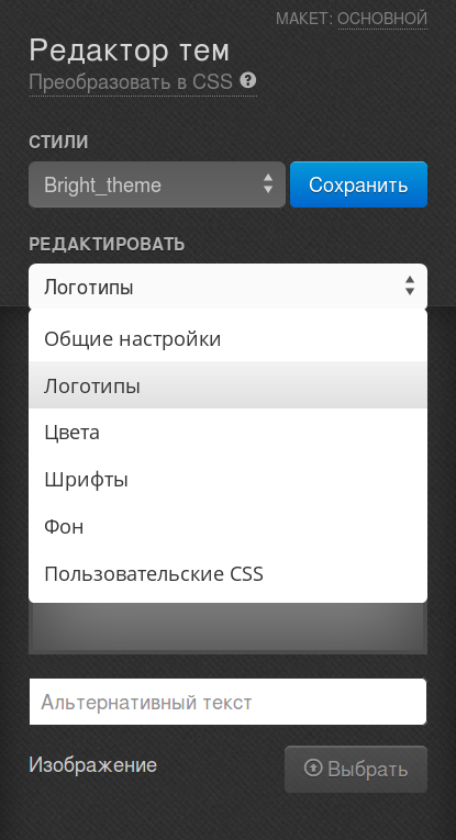 Откроется витрина, на которой слева будет панель редактора тем. В выпадающем списке Редактировать выберите вариант Логотипы.