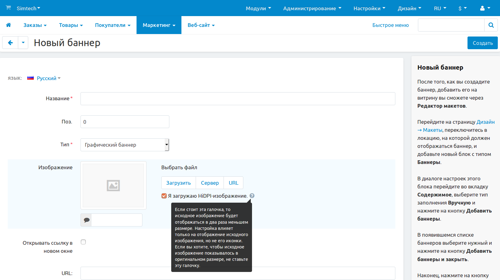 • При загрузке такого изображения ставить галочку Я загружаю HiDPI-изображение. Так CS-Cart будет знать, что для обычных экранов надо разрешение этого изображения уменьшить в 2 раза.
