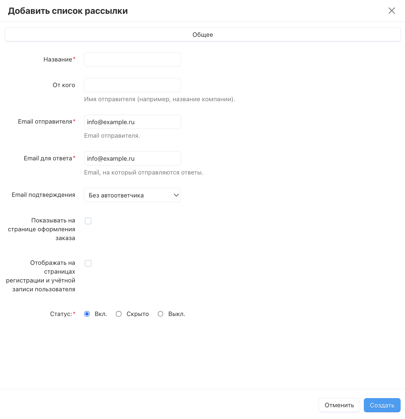 - Статус — выберите желаемый статус списка рассылки.