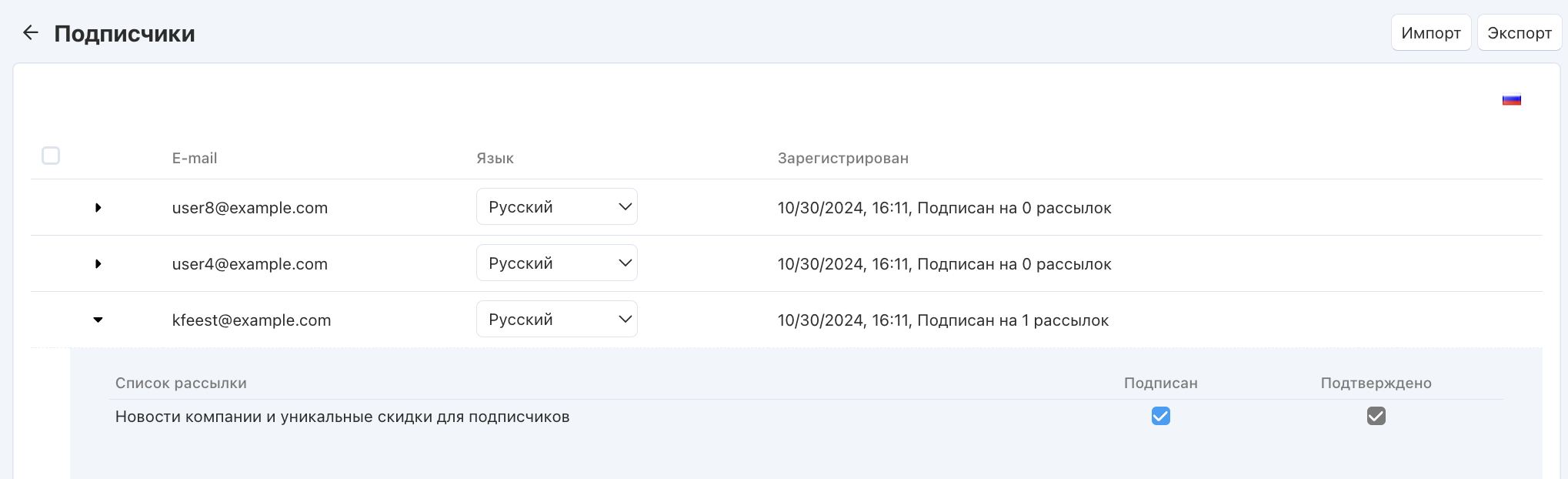 - Перейдите в раздел Маркетинг → Рассылки → Подписчики.