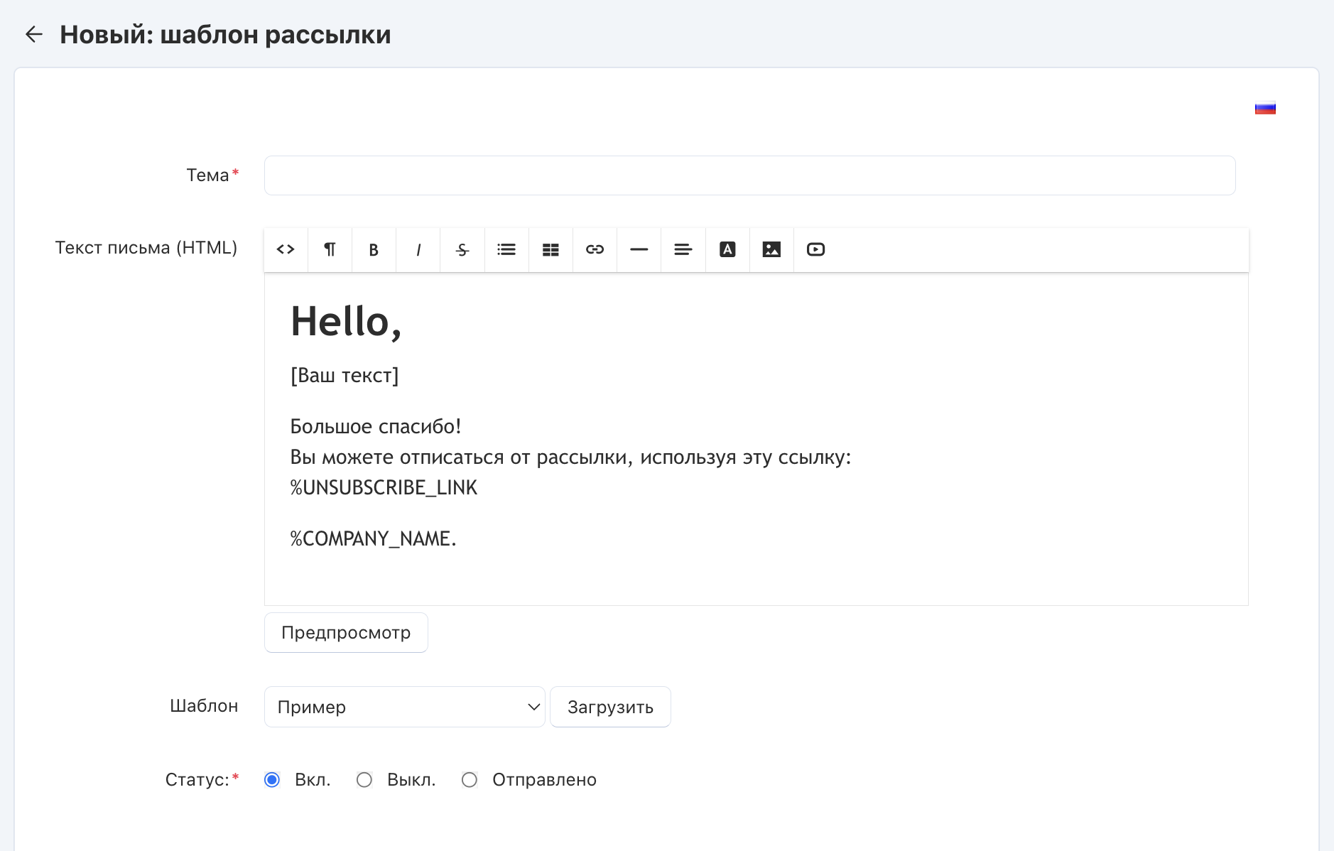 Текст письма (HTML) — введите содержимое шаблона. Вы можете использовать визуальный редактор или ввести HTML-код.