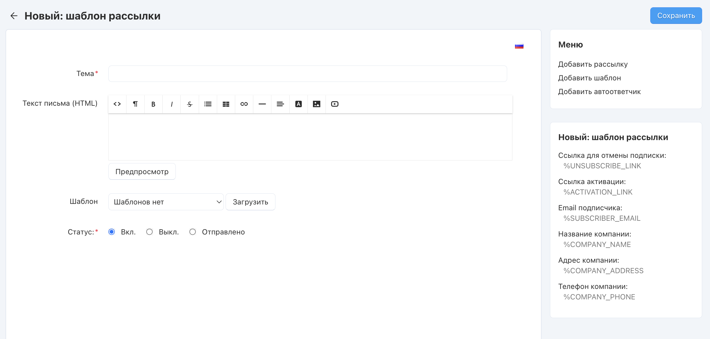 Вы сможете загрузить созданный шаблон при редактировании рассылки.