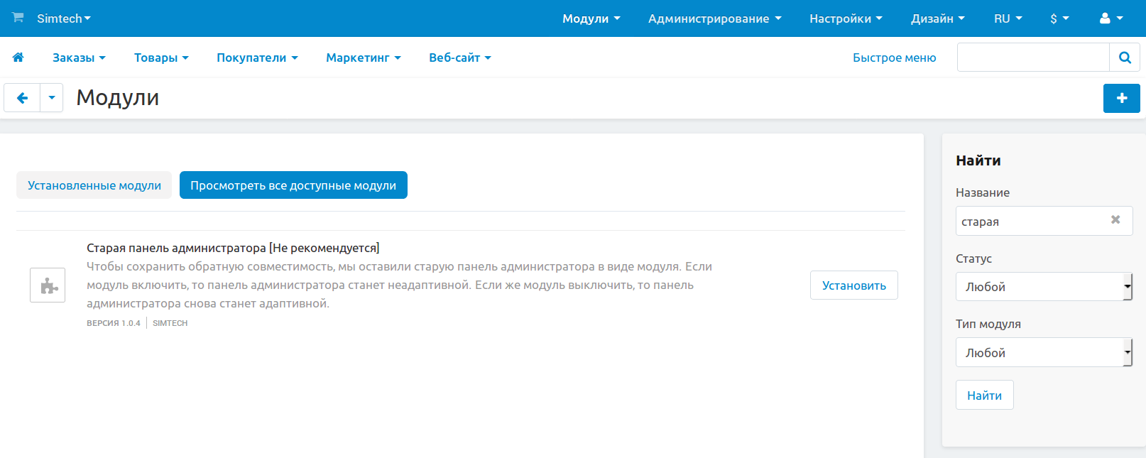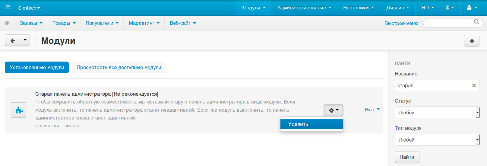 Если модуль Адаптивная панель администратора [Beta] не был включен при обновлении до версии 4.8.1, то модуль Старая панель администратора [Не рекомендуется] будет автоматически включен после обновления.