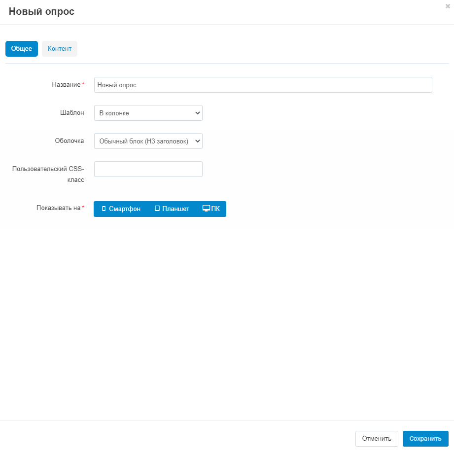 4. В открывшемся окне укажите название блока (например, Новый опрос). В поле Шаблон выберите В колонке и нажмите Создать.
