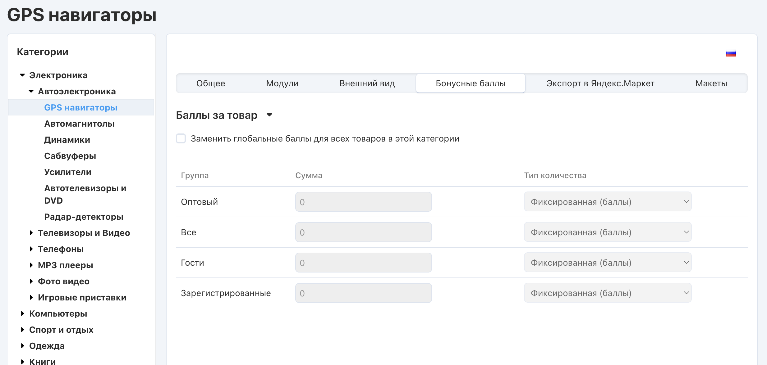 Поставьте галочку Заменить глобальные баллы для всех товаров в этой категории.
