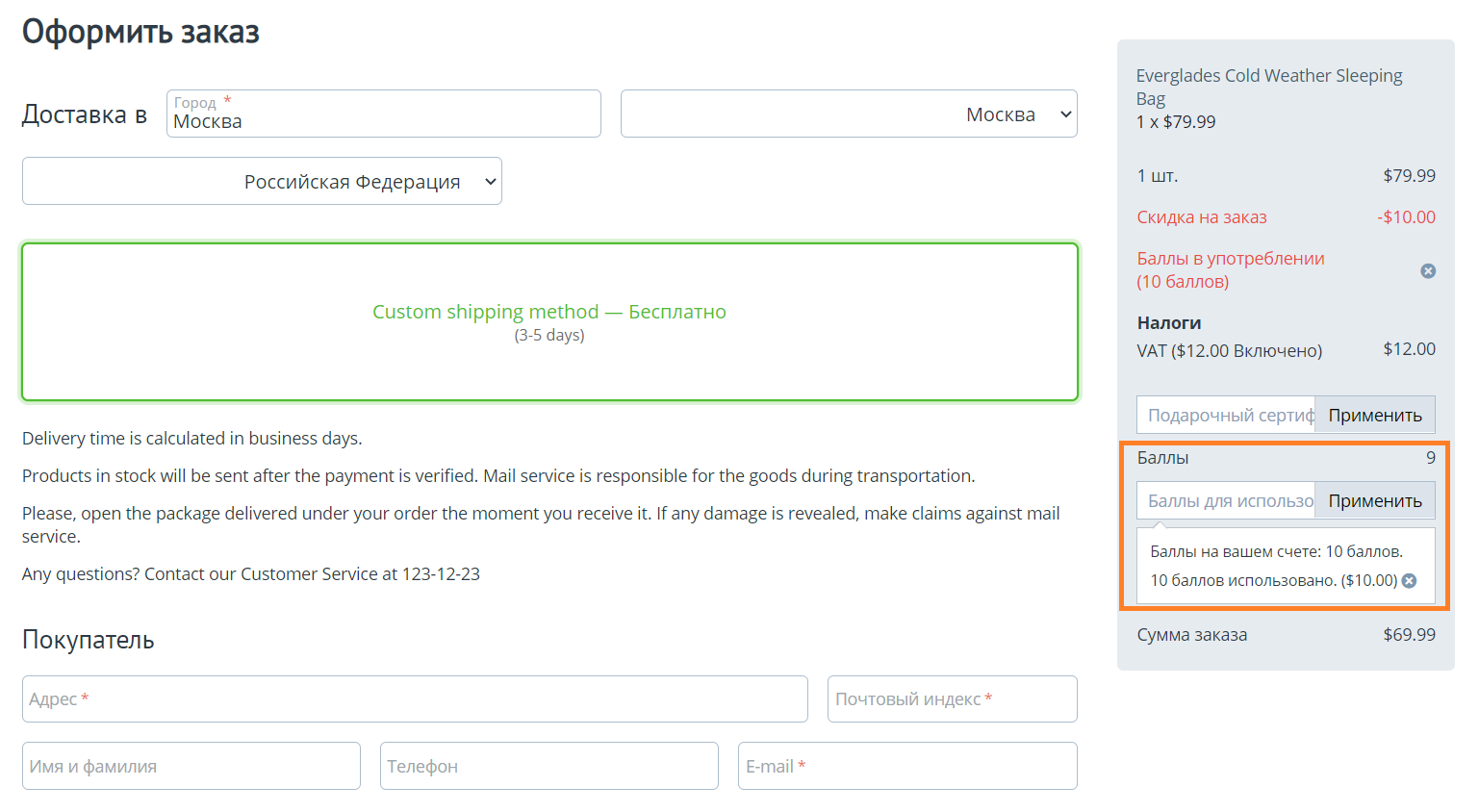 Если покупатель хочет использовать бонусные баллы, то при оформлении заказа нужно ввести нужное количество баллов в соответствующее поле. Сумма покупки уменьшится в соответствии с курсом конвертации баллов, а остаток можно оплатить любым доступным способом оплаты.