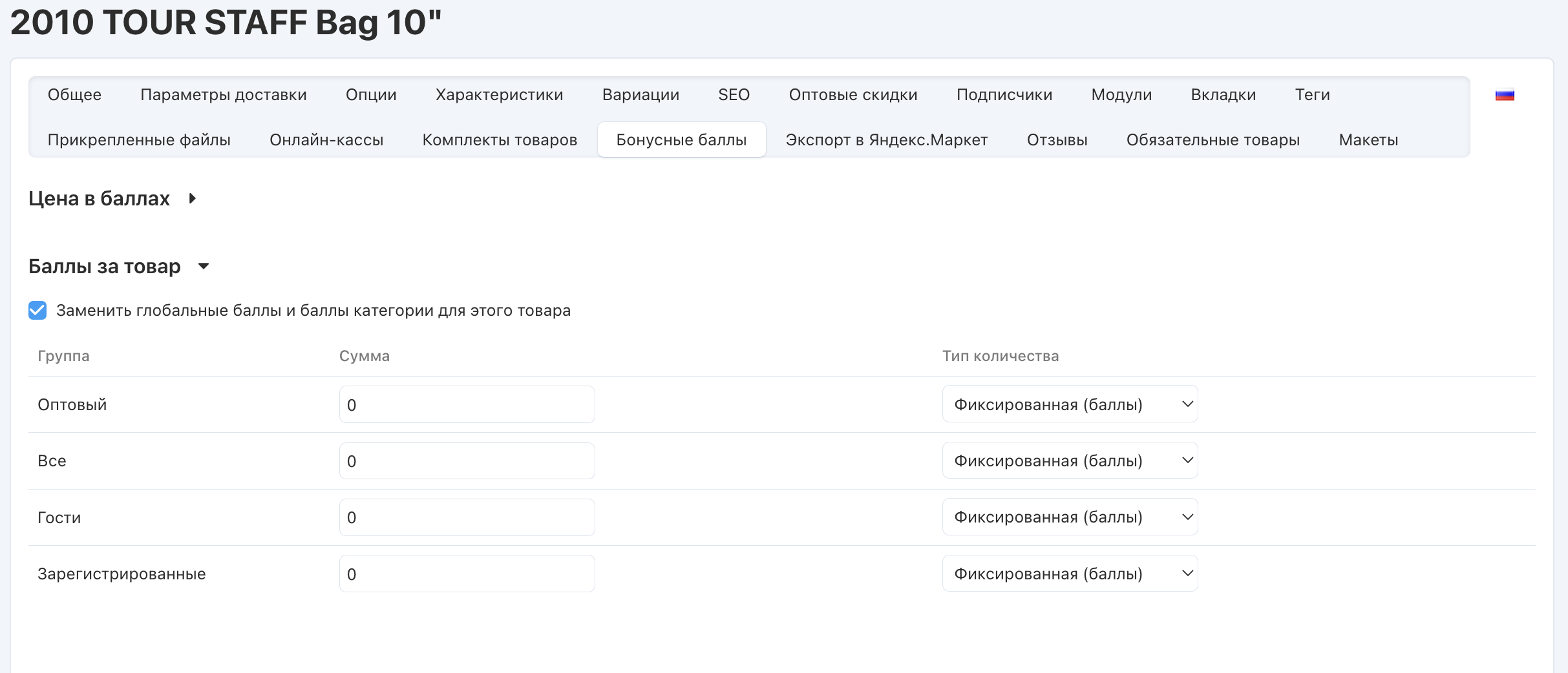 Поставьте галочку Заменить глобальные баллы и баллы категории для этого товара.