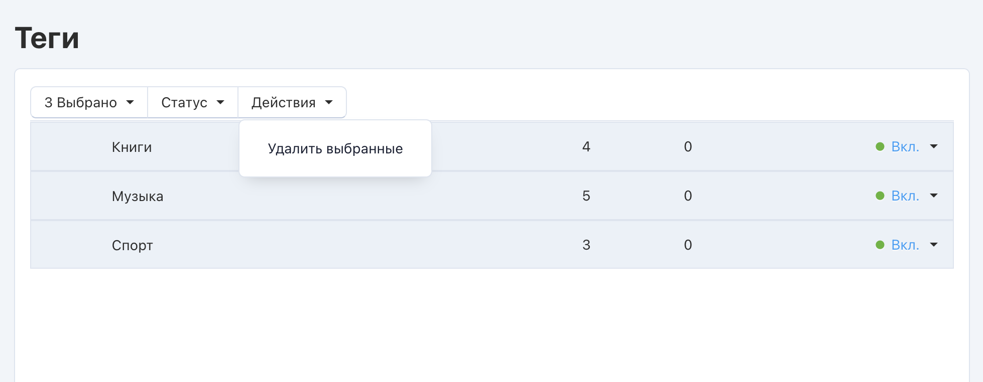 Удалить тег можно, нажав на кнопку с изображением шестеренки и выбрав пункт Удалить. Кнопка появляется, если навести курсор мыши на тег. Для массового редактирования отметьте нужные теги, кликнув на них в списке, и используйте кнопки, появившиеся над списком.