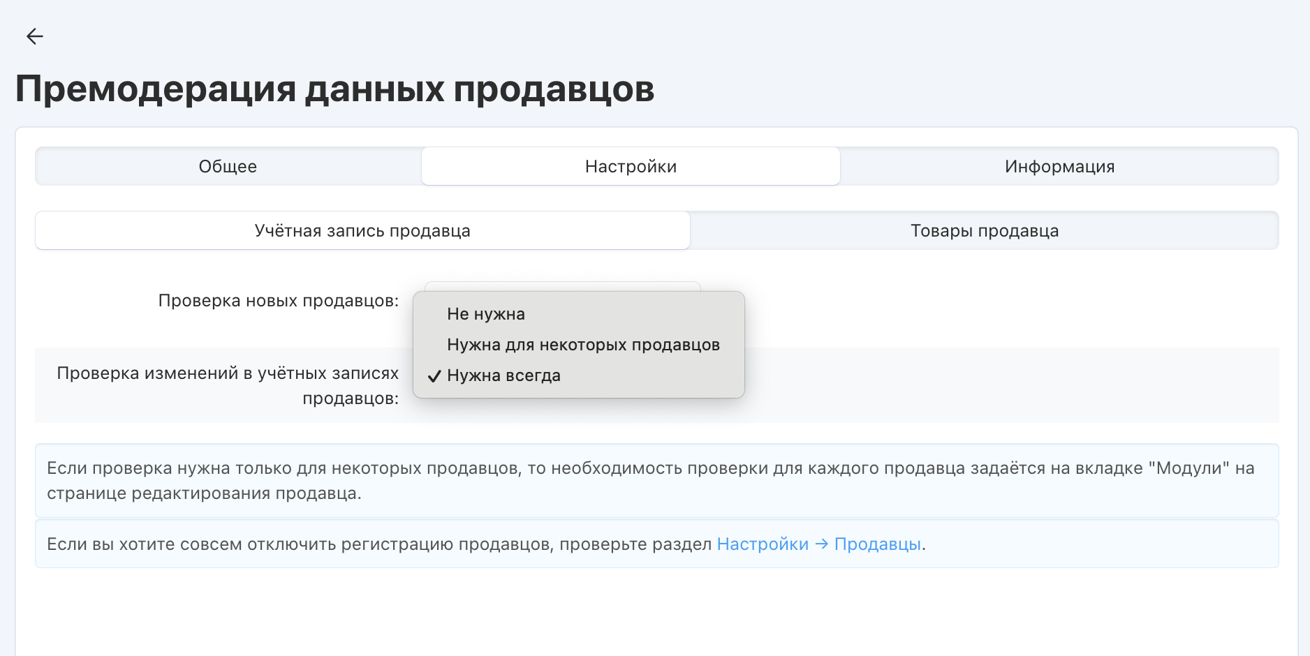 • Нужна для некоторых продавцовна страницах редактирования продавцов на вкладке Модули появится настройка, которая определяет, нужно ли утверждать данные от этого продавца в этом случае.
