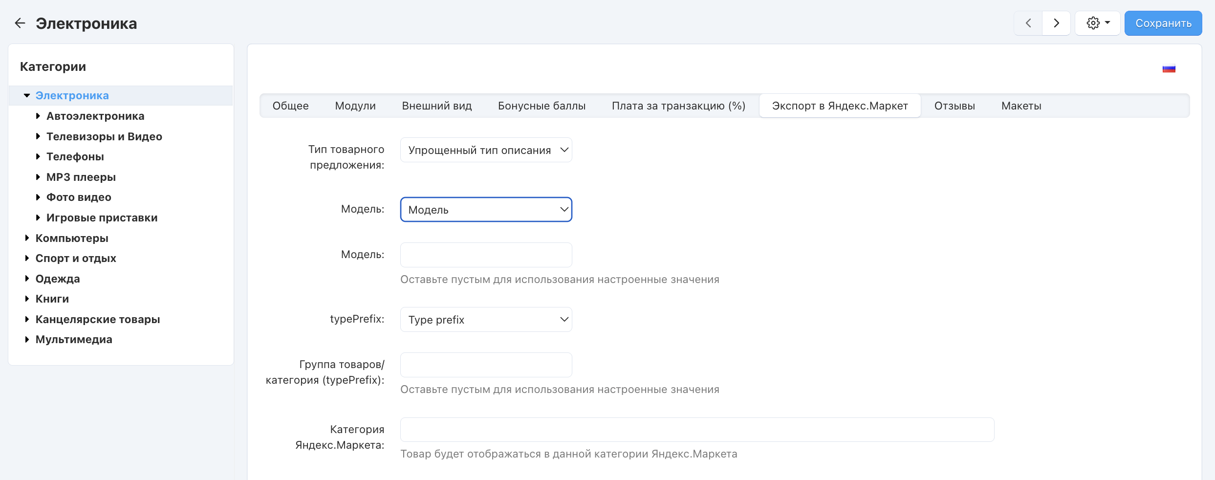 Модуль Экспорт в Яндекс.Маркет добавляет новые настройки для категорий интернет-магазина.