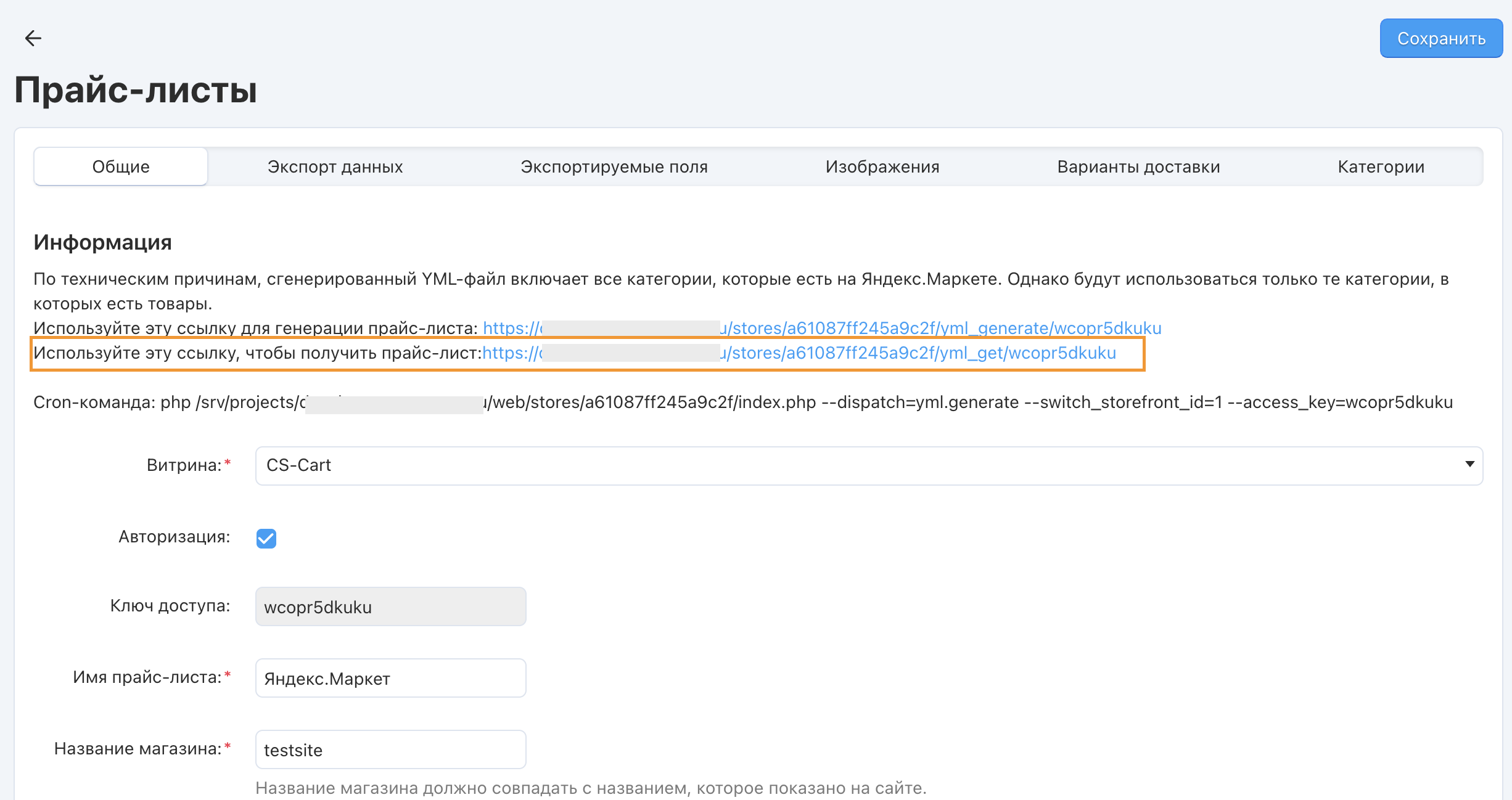 | Ключ доступа | Ключ для доступа к прайс-листу при включенной настройке авторизации |