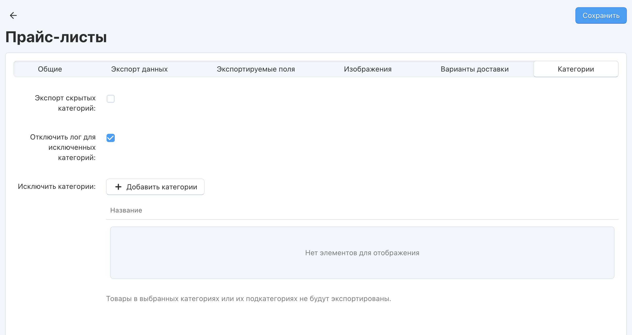 | Экспорт скрытых категорий | Если включить настройку, то товары будут экспортироваться, даже если они находятся в скрытых категориях. |
