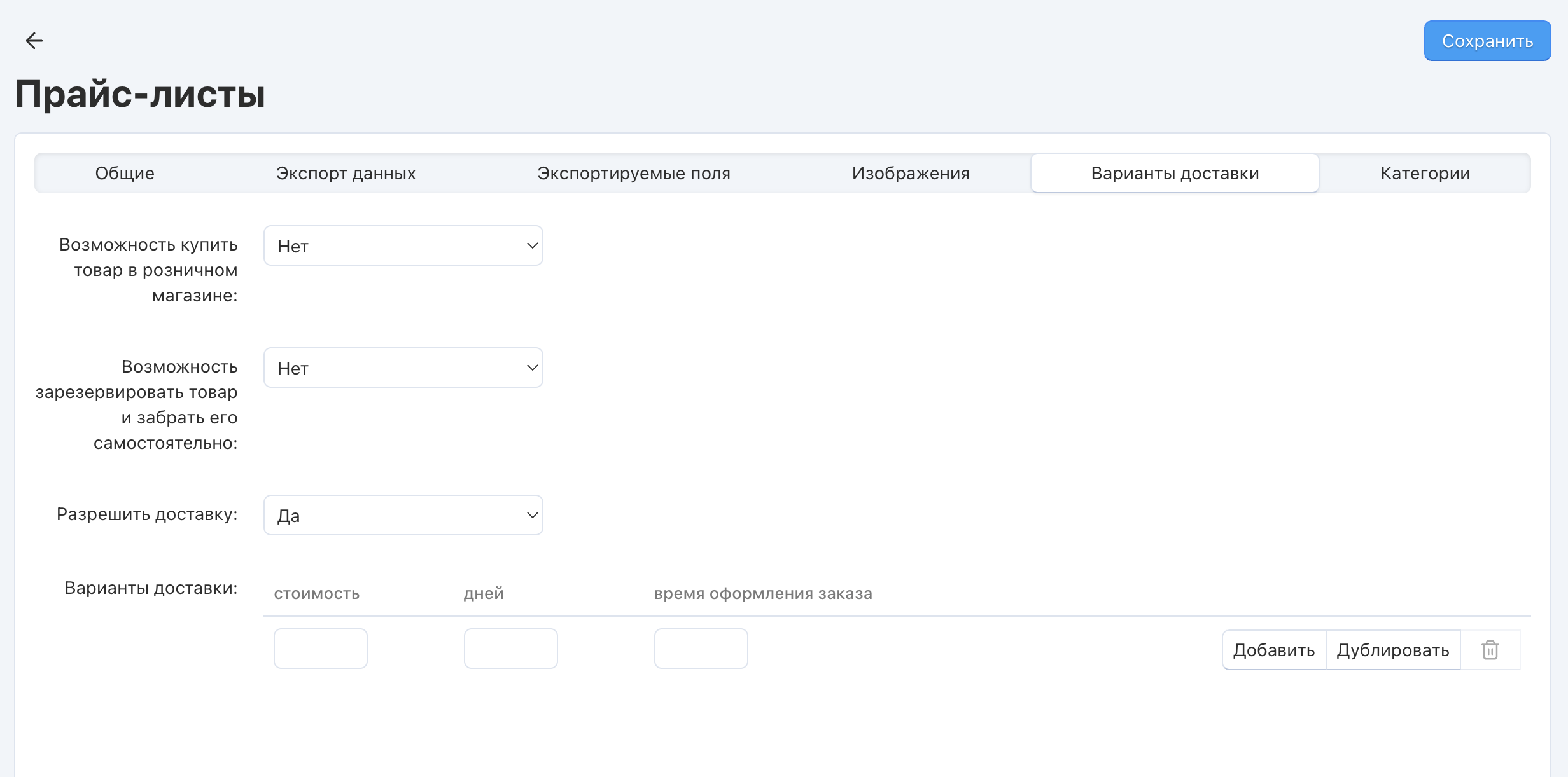 | Имя прайс-листа | Имя, которое будет отображаться в списке прайс-листов |