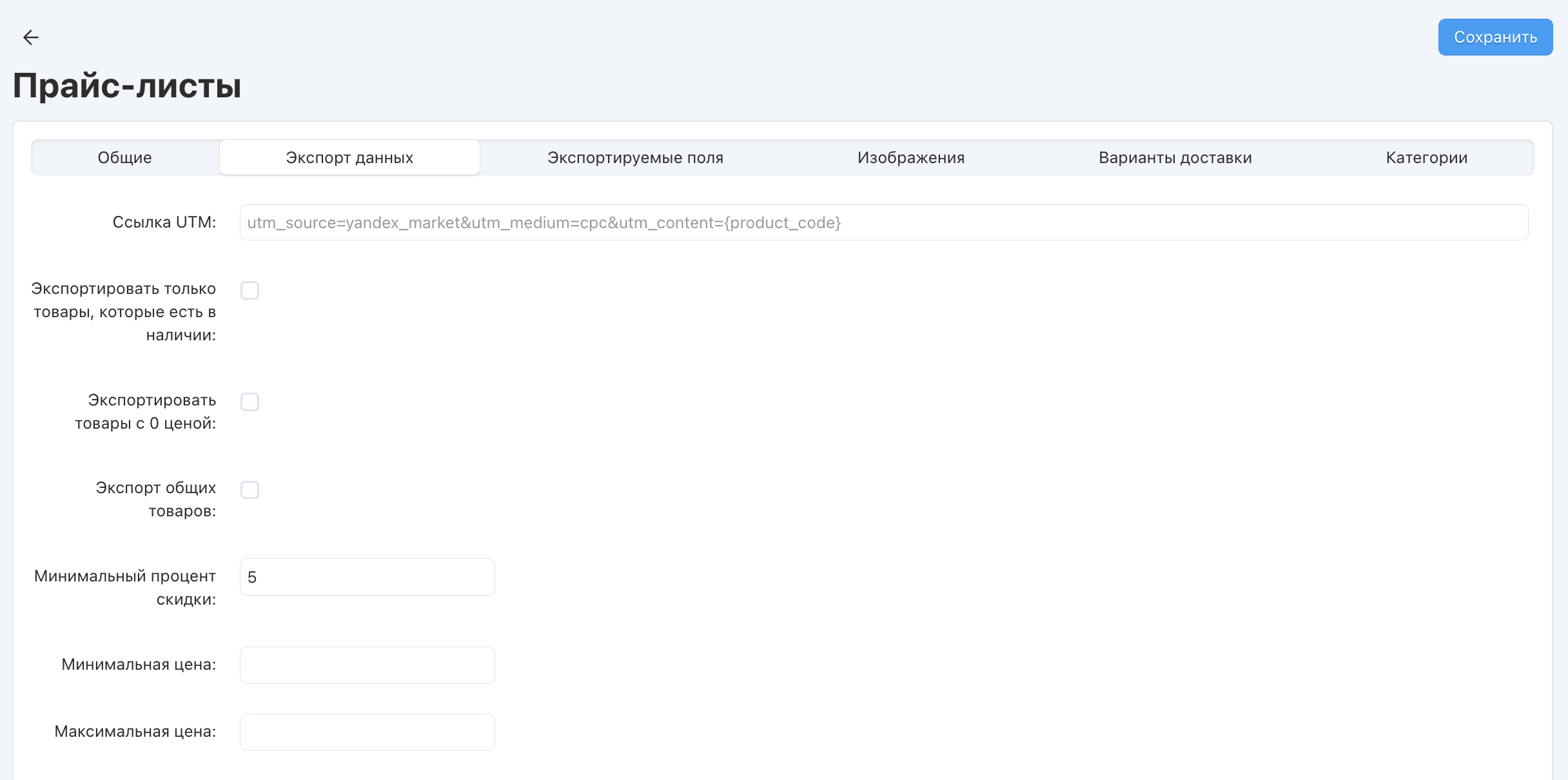 - Создайте новый прайс лист или откройте редактирование существующего на странице Модули → Экспорт в Яндекс.Маркет.