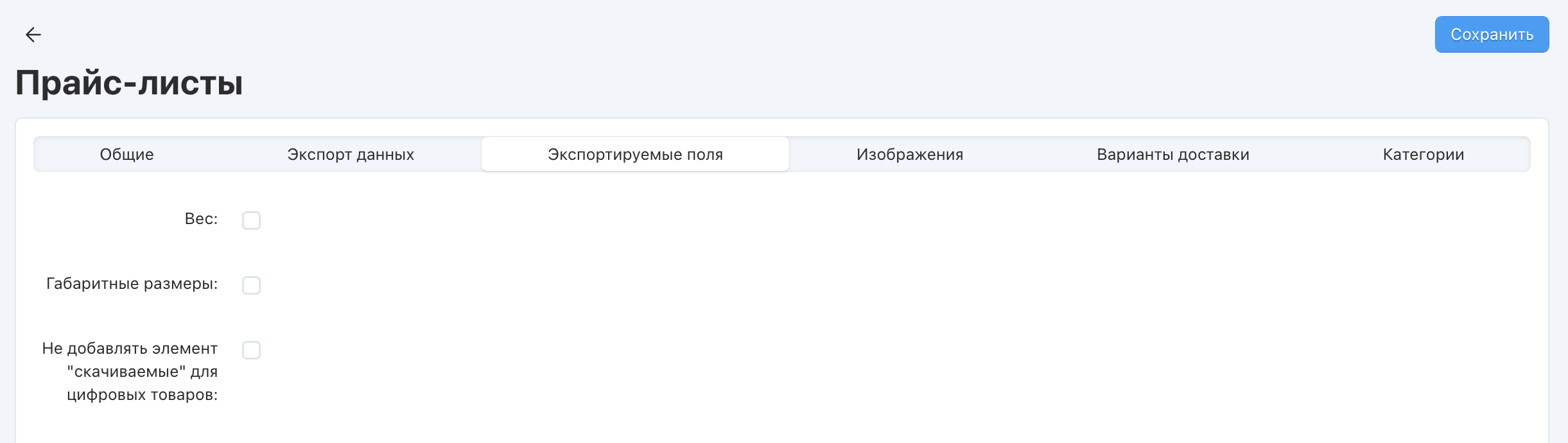 | Вес | Выгружать вес товара, который указан для товара во вкладке “Параметры доставки” редактирования товара |