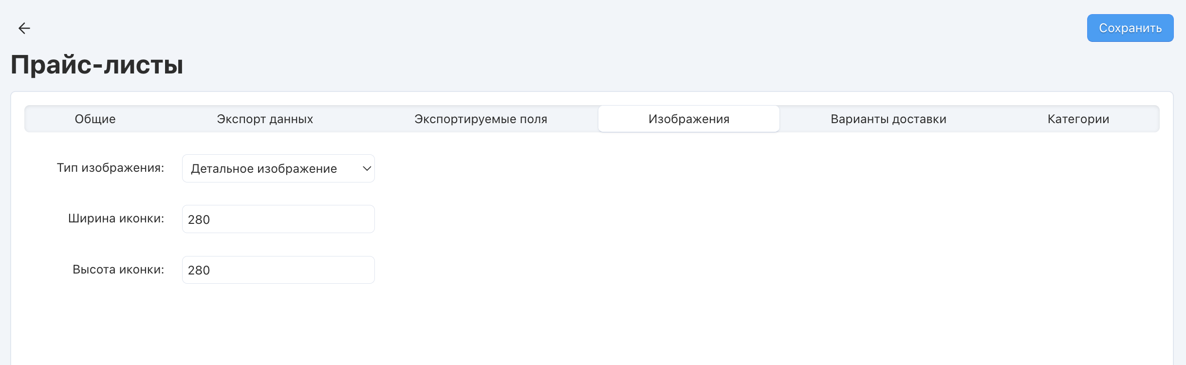 | Тип изображения | В прайс-лист могут быть выгружены полные изображения или уменьшенные копии (иконки). Иконки будут созданы автоматически. |