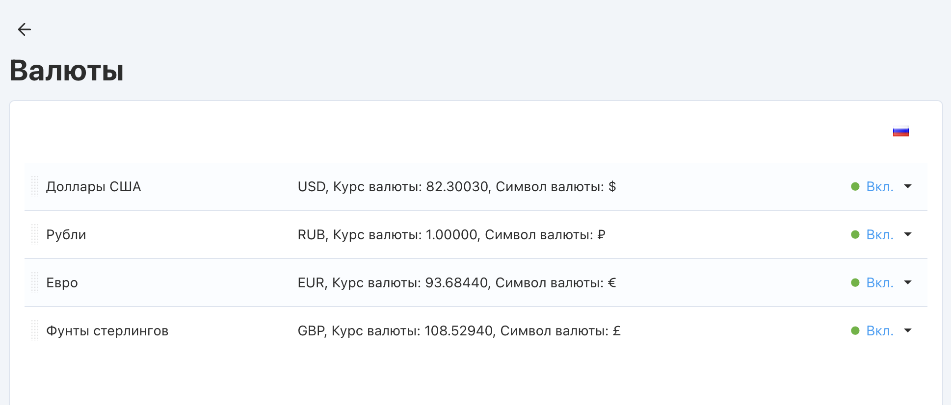 Вы можете редактировать валюты на странице Настройки → Валюты.