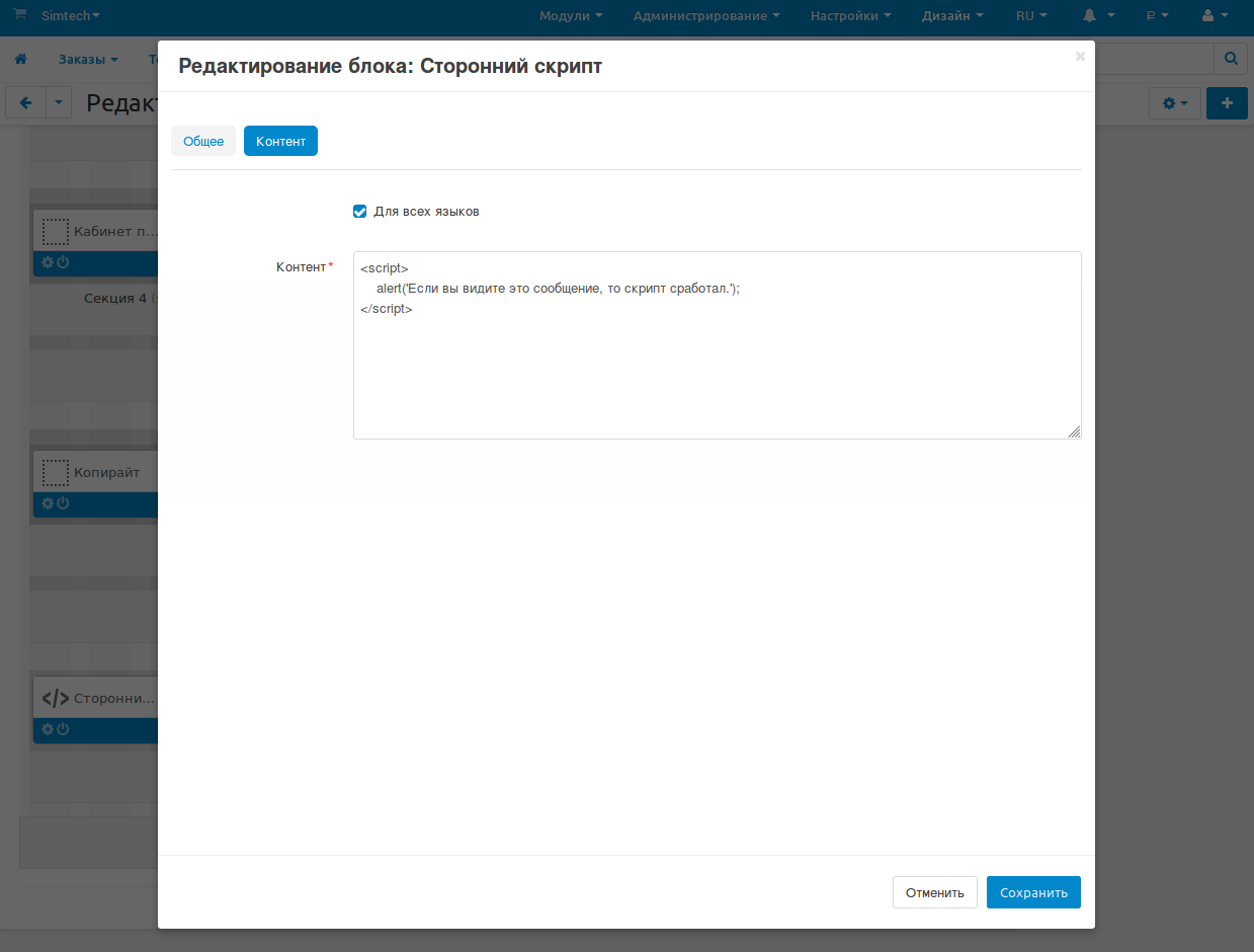 Вставьте ваш код на вкладке Контент и сохраните изменения. Обратите внимание, что содержимое блока зависит от языка.