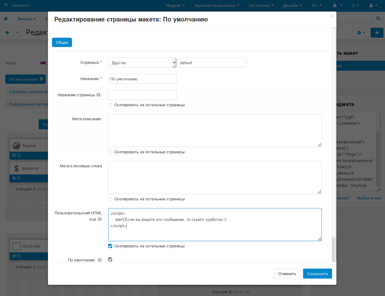 Иногда код просят добавить внутри тега <head>...</head>. Делается это в настройках страниц макетов, в поле Пользовательский HTML код. От того, для каких страниц макета вы его добавите, зависит, где в вашем магазине код будет, а где — нет.