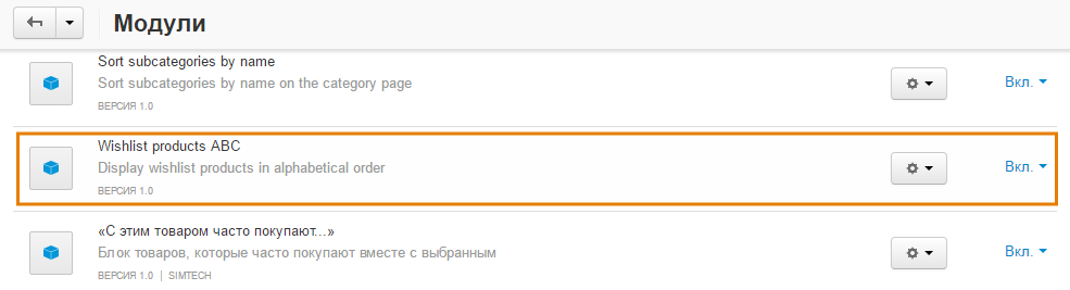 После установки модуль Wishlist Products ABC появится в списке модулей. По умолчанию модуль включен и сразу начинает работу.